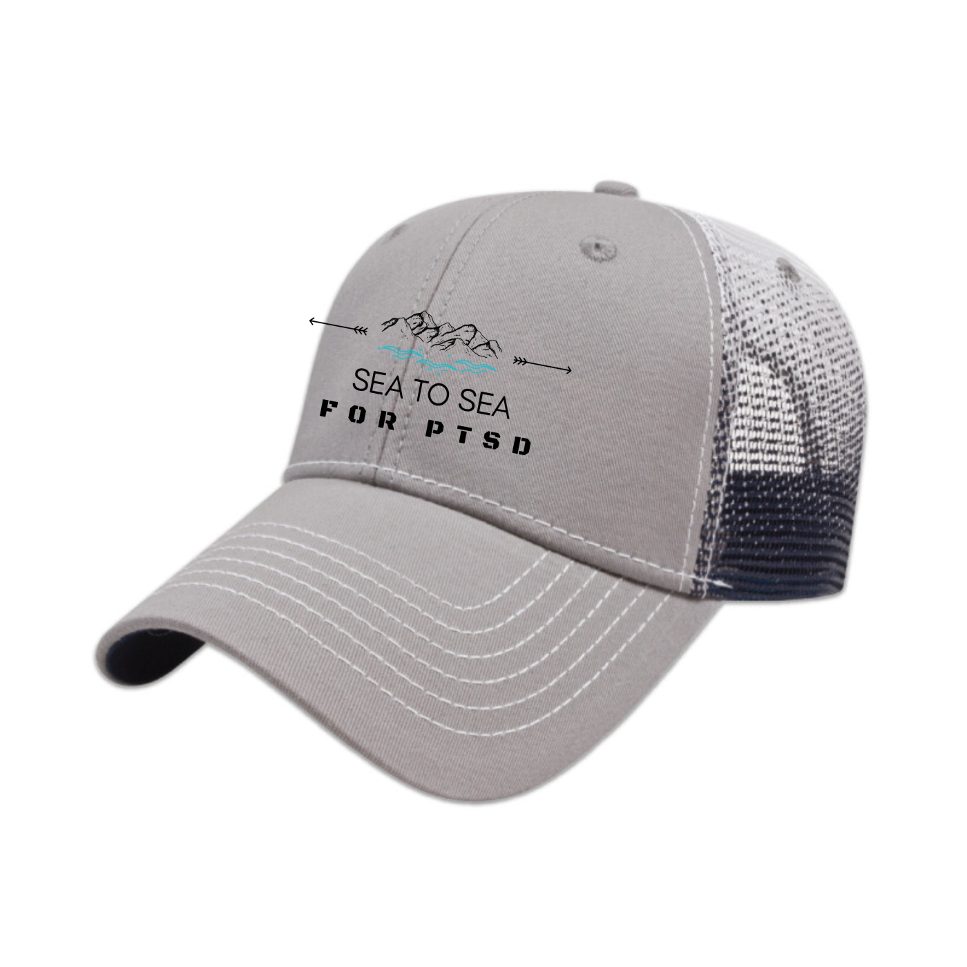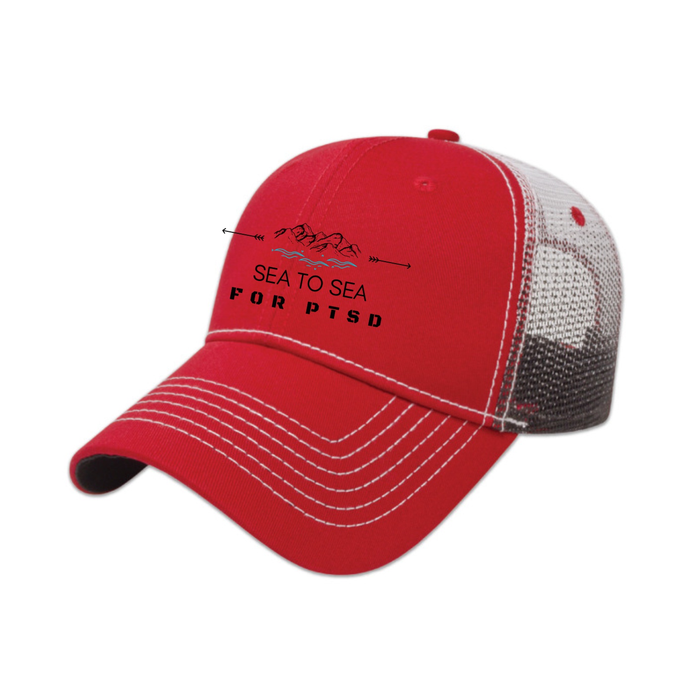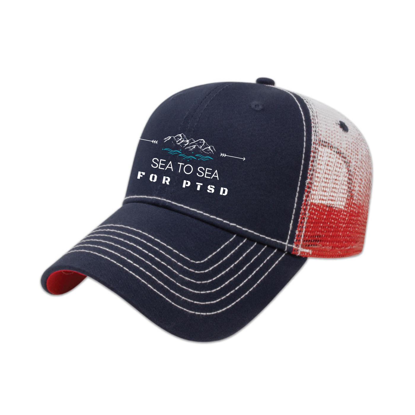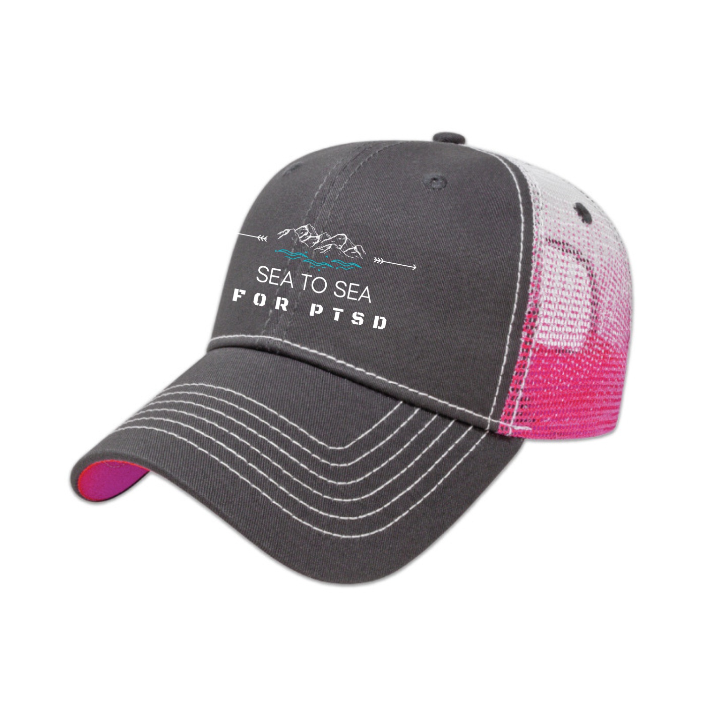 • Low profile six panel structured cap • Chino twill with mesh back • Screen printed gradient on mesh with color matching undervisor • Two-tone adjustable plastic snap tab